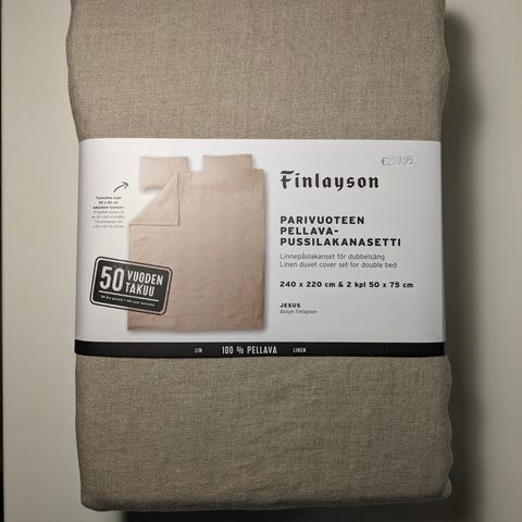 Käyttämättömät Finlaysonin Jesus pellavalakanat myyntipakkauksissa.