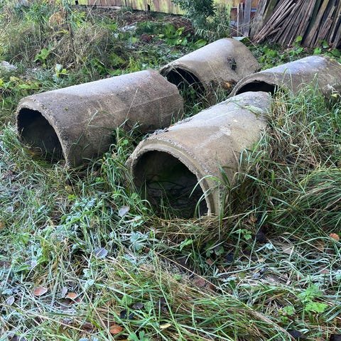 Vahvoja betonisia rumpurenkaita 11 kpl, yhteispituus noin 9 m, halkaisija 50 cm.