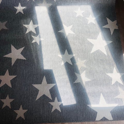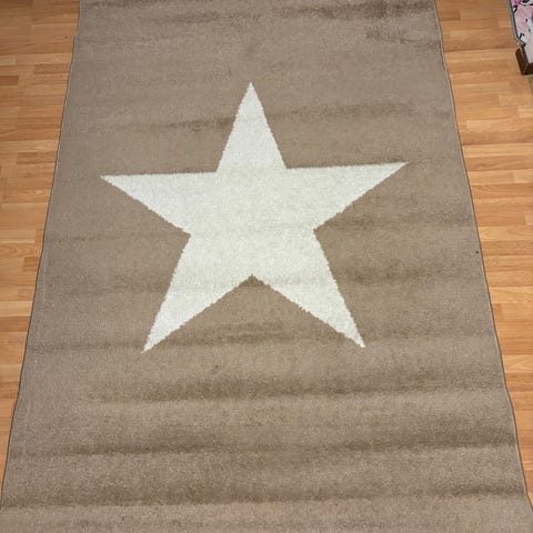 Vaalea tähtimatto. Mitat 119 × 172cm. Juuri pesty, enkä varsinaisesti tahroja huomannut, mutta koirankarvat sen verran tiukassa, etten saanut kaikkia pois.