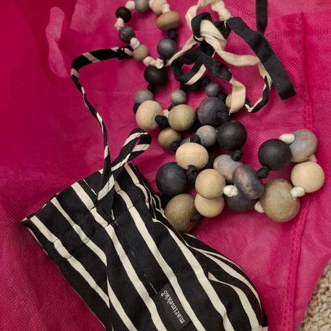 Kuin uudet kangaspäällysteiset Marimekon pitkät helmet ja käsikoru samaa settiä omissa pusseissaan. Pitkän korun saa kierrettyä kaksinkertaisesti kaulan ympäri. Lila-ruskeaa tasaraitakuvioita. Nouto Tampere Korkinmäki tai toridiilipostitus.