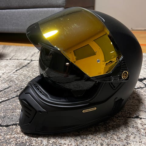 Kuvan mukainen Scorpion Exo -visiiri ja kaikki kuvassa näkyvät tarvikkeet settinä (Pinlock-kotelo mallina, se on tyhjä). Visiirin välimitta kiinnitystasosta noin 24 cm. Korkeus noin 13 cm.