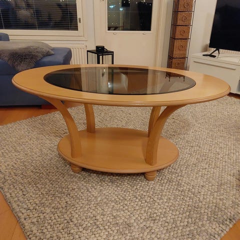 Mäntypuinen olohuoneen pöytä. Jonkin verran naarmuja ja pieniä kolhuja pöydässä, muuten ehjä ja jämäkkä pöytä. Käyttöön tälläisenään tai aihio tuunaukseen. Asko-liikkeestä joskus ostettu.