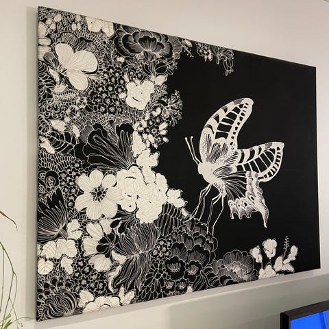 Jurmo kankaasta tehty taulu. Kangas on kevyesti niitattu taakse (ks kuva 2) halutessaan voi irrottaa. Mitat 120x80. Takana rautalanka ripustusta varten. Vain nouto tai omien menojen mukana Pirkanmaa.
