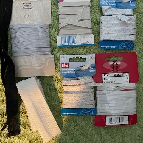 Myynnissä setti ompelutarvikkeita. Sisältää mm. Kuminauha, koristenauhat ja pitsit.
