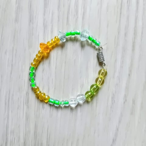 Siistikuntoinen rannekoru jossa kumilanka sisällä. Joissain helmissä aavistus kulumaa. Materiaalista ei ole tietoa.