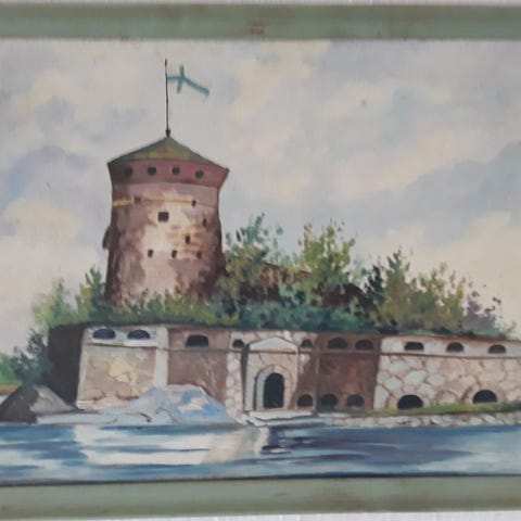 Taulu, jossa on maisema-aiheinen öljyvärimaalaus. Kuvassa on Olavinlinna. Korkeus 44,5cm ja leveys 35cm.