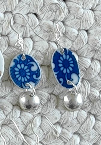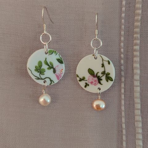 Särkyneestä astiasta leikattu posliini riipus. Metalliosat ovat sterling hopeaa ja helmet makeanveden helmiä. Papukaija lukko. Itse tehty.