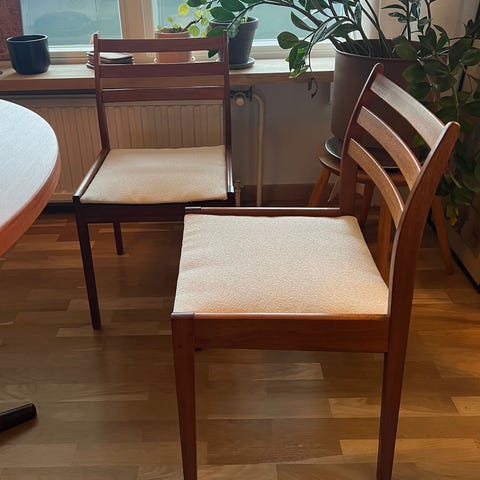 Vintage tuoli, tiikkivanerinen istuin ja selkänoja, teräsputkirunko. Suunnittelijasta ei tietoa. Verrattain siistissä käyttökunnossa, toki käytön jälkeä myös löytyy. Istuinkorkeus 42 cm.