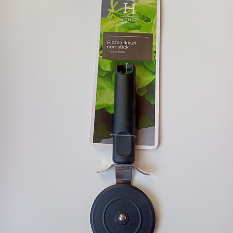 Hyvässä kunnossa oleva ruostumattomasta teräksestä valmistettu pizzan leikkaaja.