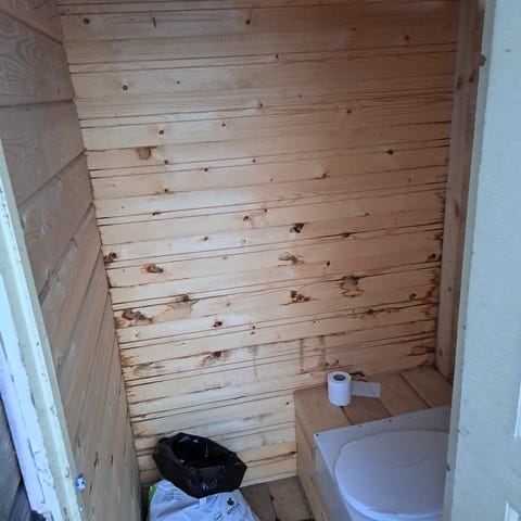 Musta peltikate ja rakolattia kestopuusta. Oviaukko pitkällä sivulla.