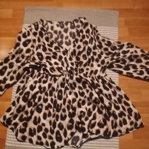 Etuosa ruskeansävyinen leopardikuvioinen, jossa keskellä kaula-aukossa rypytys ja siinä ruskea nauha.