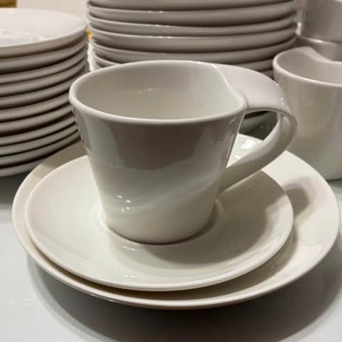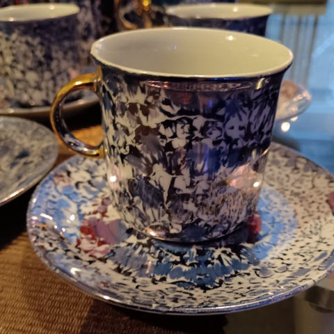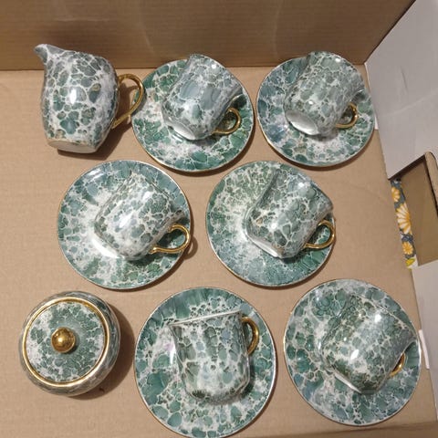 Hieno astiasto itse maalattu, en mä 😀 8xkuppi+tassi+pullalautaset + sokerikko+ kermakko ja iso kakkulautanen.