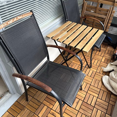 Ikeasta vuosi sitten hankittu parvekkepöytä ja kaksi tuolia. Juuri öljytty, täysin ehjät kalusteet.