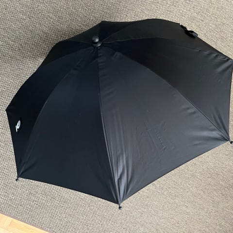 UV-varjo/parasol rattaisiin. Hieman värjäymää, muutama kuluneempi kohta, ks kuvat. Väri oranssinpunainen, ei missään kuvassa ihan kohdillaan. Toimiva mekanismi, asentoa/kulmaa voi säätää kahdesta kohtaa. Säädettävä kiinnitys.