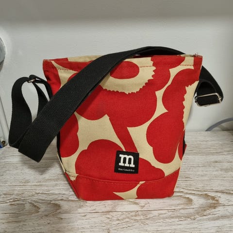 Iltanen-olkalaukku (crossbody, messenger) on valmistettu paksusta Pieni Unikko-kuosisesta puuvillamarkiisista. Laukussa on säädettävä olkahihna ja vetoketjusuljenta. Sisäpuolella on yksi avoin tasku.Unikko syntyi vuonna 1964, aikana, jolloin kukat eivät kuuluneet Marimekon kuviomaailmaan. Maija Isola halusi luoda tästä teemasta jotakin uudenlaista ja kiinnostavaa, ja suunnitteli kokonaisen sarjan vahvoja kukkakuoseja.