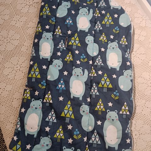 Vanha äitiyspakkauksen makuupussi, joka itse päällystetty vettäpitävällä kankaalla. Käsin ommellut aukot valjaille ja alhaalla tarrakiinnitys. Sisäpuolen kankaassa joitakin läikkiä