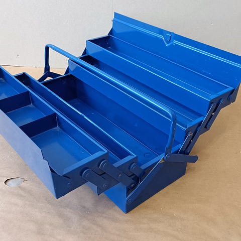 Kuvan työkalupakki, neljä eri tasoa, joiden sisältö selviää kuvista. Sisältää paljon hylsyjä, avaimia, yms. tavaraa. Ulkoisesti pientä kolhua ja varastoinnin jälkeä, mutta työkalut käyttämättömiä, tuli toisen kaupan yhteydessä kerralla.