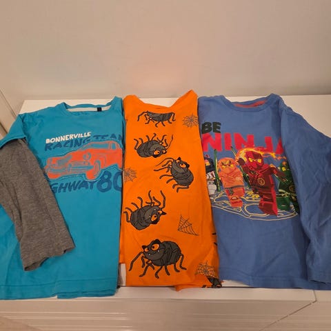 Poikien t-paitasetti on kokoa 116 ja paidat on ostettu lapselle uutena, joten ne ovat vielä siistejä ja suht hyväkuntoisia. Settiin kuuluu: