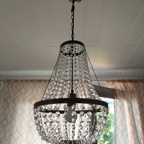Myydään uuden tieltä kattovalaisin, joka raakametallia. Kruunupistoke. Kattokuppi metallia, kiinnike kattokoukulle. Halkaisija 70 cm, korkeus 53 cm. Paino 12 kg. Johdon pituus 100 cm. E27. Enintään 60 W.
