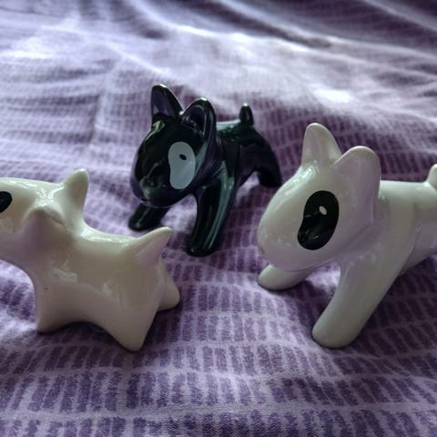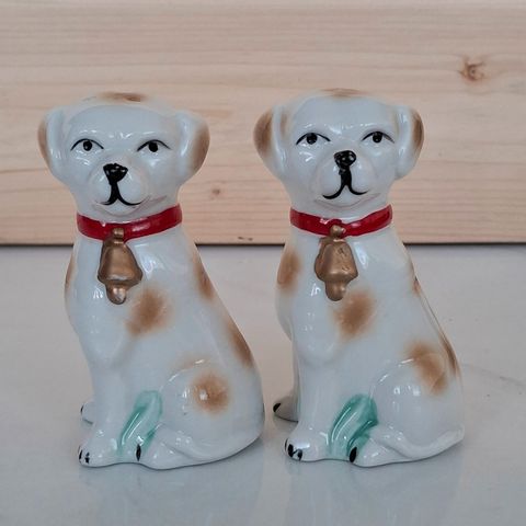 Ihastuttava posliininen suola- ja pippurisirotinsetti, jossa on valkoinen ja musta skotlanninterrieri.