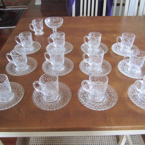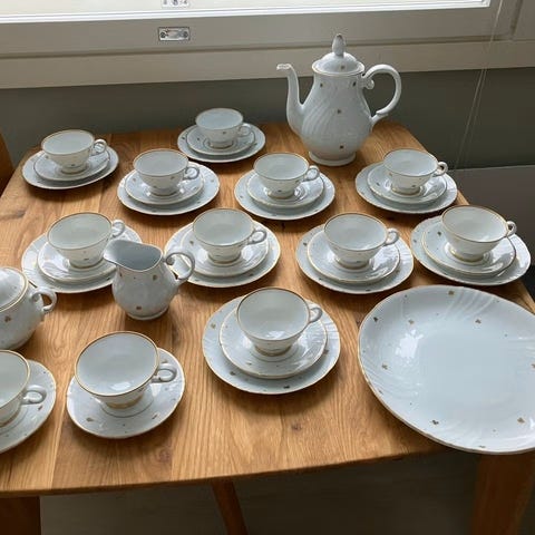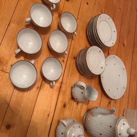 Kerttu Nurmisen Nuutajärvelle suunnittelema Apila-kahviastiasto. 6 kpl kahvikuppeja ja lautasia, 10 kpl leipälautasia ja sokerikko ja kermakannu. Astiasto lähes käyttämätön. Noudettavissa Turun keskustasta, voidaan myös kuljettaa Turun ympäristöön.