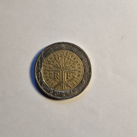 Lyöntivirhe, Ranska 2 euro kolikko vuodelta 2001. Kolikko on valmistettu kaksivärisestä metallista, jossa on kuparin ja nikkelin sävyjä. Etupuolella on Ranskan kansallinen symboli, kun taas kääntöpuolella on euroalueen kartta. Soveltuu keräilykohteeksi. Tarjoa!