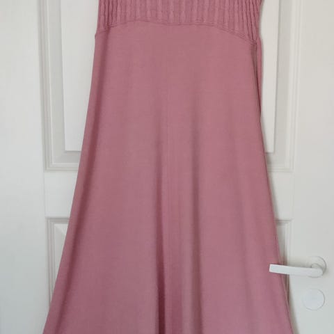 Herkän vaaleansininen kevyt puuvillamekko, jonka selässä kaunis pitsikuvio. Puuvillaa, pehmeää kangasta, vähän pellavamainen. Kevyt ja ilmava, kokolappua ei ole, mutta noin koolle M, jopa m-l.