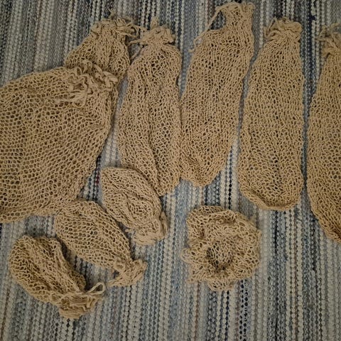 Muovisia verkkopusseja esim. Omenoille, porkkanoille, sipuleille kuivatukseen tai varastointiin. Noin 20-30 litraa tilavuudeltaan. Ainoastaan euron kpl.