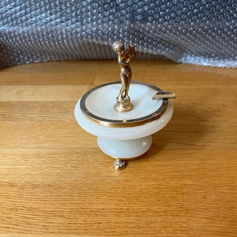 Eilat kiveä. (Sekoitus Kupari mineraalia, malakiittia, azuriittia, turkoosia, pseudomalakiittia ja krysokollaa). Sikäli harvinainen että kiven louhinta on jo lopetettu. Epoksiin upotettu simpukankuori, tuhkakupiksi. Koko, 18x13,5x2,5cm. Paino 1,229 kg. Ullanlinnasta nouto tai postitus