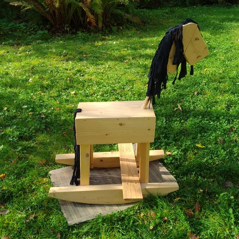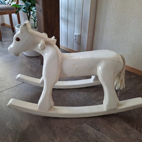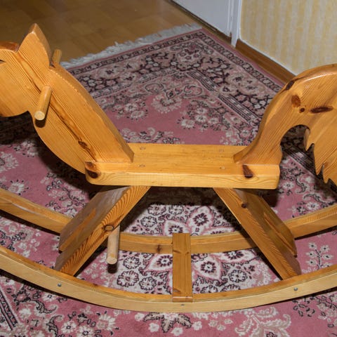 Tukeva puinen keinuhevonen. Tilaa myös jaloille molemmin puolin.