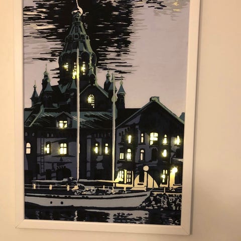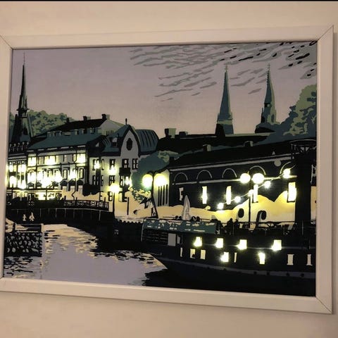 Upea ledvaloilla ja puukehyksillä varusteltu taulu. Koko 45*45cm