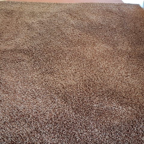 Erittäin hyväkuntoinen iso matto. Lyhyt nukka. Ei sovi värinsä puolesta enää meille. Ei tahroja tai muita jälkiä. Pentukoira on saattanut joskus pissiä siihen, mutta ei ole tosiaan jälkiä missään ja putsattu etikalla. Halutessaan maton voi pestä vaikka tekstiilipesurilla. Toinen samanlainen pesty joskus painepesurilla, eikä mennyt miksikään. :)