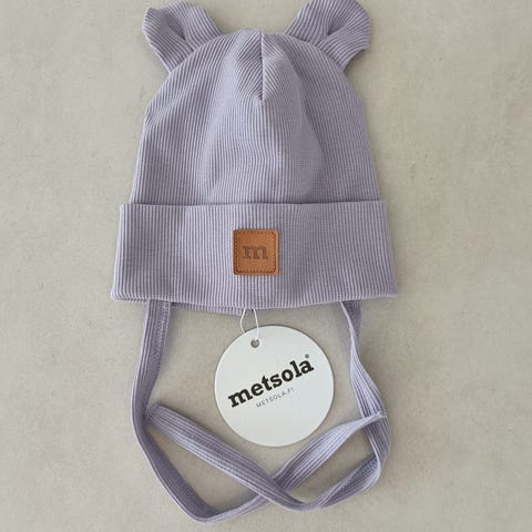 Metsola nauhallinen ribbipipo sävyssä ruskea / peanut. Söpöt nallenkorvat. Kokolapussa 6-12kk mutta pientä kokoa, vastaa mielestäni enemmän 0-6kk kokoa, unisex malli.