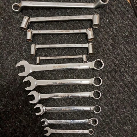 Käyttämätön lenkkisarja koot 12-19 eli 8 kpl. Tukeva foam alusta jonka voi työkalukärryynkin laittaa.