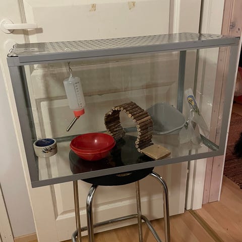 Toiminut viimeisimpänä kääpiöhamsterin viihdekeskuksena, aiemmin akvaariona. Ikä noin 20 vuotta. Huom. katto-osa avoin (huomiona, jos tulee pois pääsevien käyttöön).