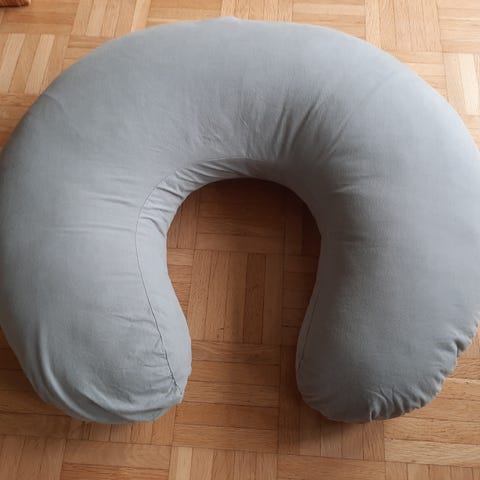 Kuvan imetystyyny. Vaalean kellertävä. Tämä ei ole sellainen pullea ja korkea vaan täytettä on vähemmän ja tyynyä on sen vuoksi helppo muokata haluamaansa asentoon. Tyyny on vanha ja meillä kauan kaapissa pyörinyt. En ole nyt pessyt päällystä mutta sen saa pestyä 60 asteessa. Yhden haalean tahran pongasin, kts. lisäkuva.