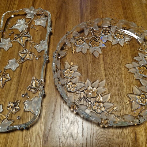 Myydään kaksi lasista, jalallista tarjoiluastiaa. Ei moitetta kunnossa.