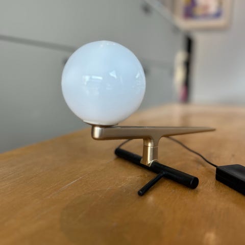 Myydään Artemiden klassikko pöytävalaisin. Varjostin suodattaa valon lävitseen kauniin pehmeänä. Säädettävä runko on kiillotettua alumiinia.