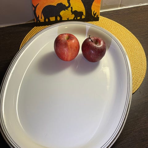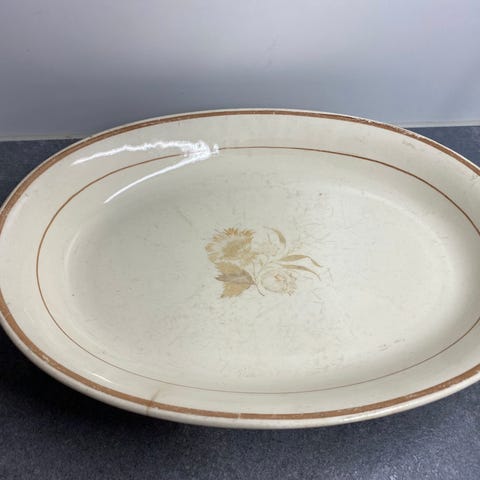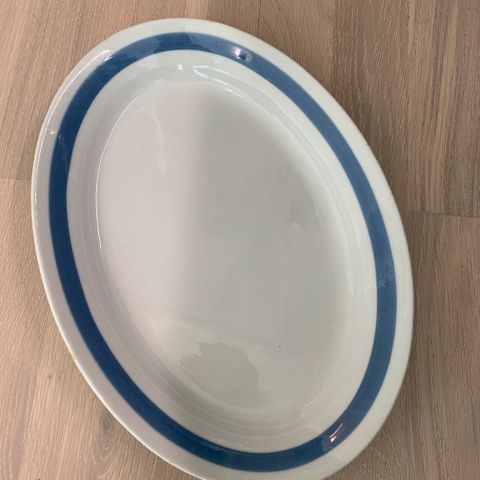 Arabian jalallinen tarjoiluvati, sininen raita. Laidassa pieni lohkeama, joka ei juuri ylöspäin näy, näkyy viimeisessä kuvassa, muuten ehjä.