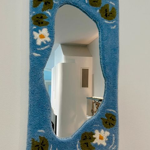 Itse tuftattu paavopesusieni teemainen peili. Peili on tummennettu ja koko kehyksen pituus noin 33cm, kiinnitys kaksipuoleisella teipillä! Huolto: imurointi ja normaali lasin pyyhintä ja jos kehyksestä törröttää pitkiä langan pätkiä, ne voi huoletta leikata tai vetää pois