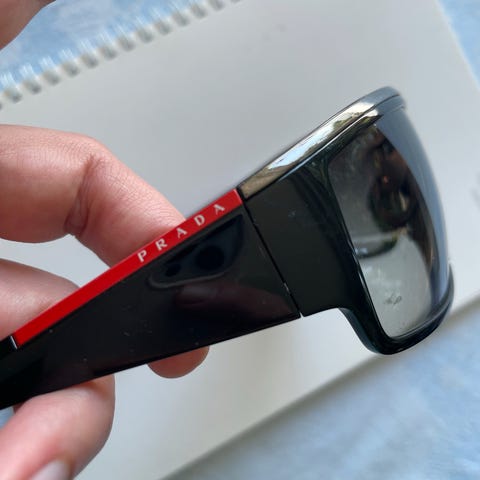 Myytävänä Pradan aidot vintage Oval silver tab Y2K Opium SPR50A -aurinkolasit. Myyn hienot lasit pois kun en enää näe ilman vahvuuksia.