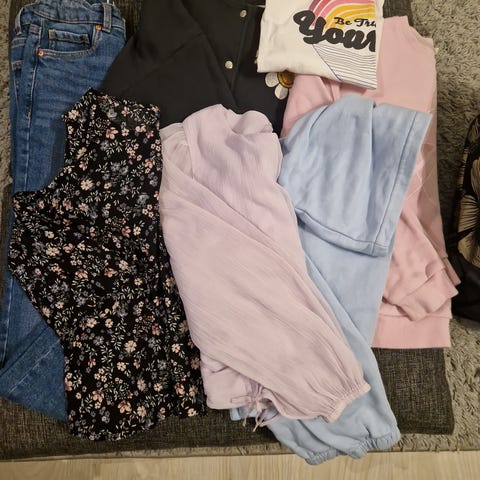 Myydään vaatesetti kokoa 146/152. Sisältää mm. farkut, 2 treenitrikoot, shortsit, collegehousut, t-paitoja, collegepuseron ja hupparin.