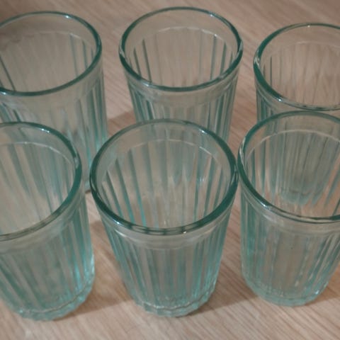 Kuusi kappaletta kulumattomia ,ehjiä,2dl:n,paksuhkoja juomalasia.