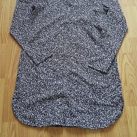 Toisen kainalon tuntumassa pieni tahra, mutta se ei näy mekon ollessa päällä. Mukavan pehmeä ja sopivasti joustava kangas. Ei nyppyjä.