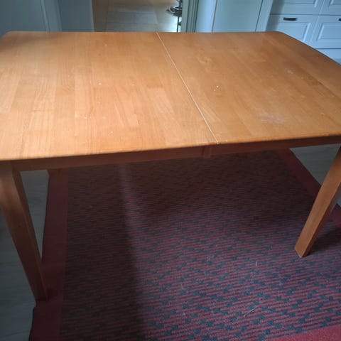 Puinen lakattu pöytä...6kpl tuoleja...istuinosa kangas päällysteinen...