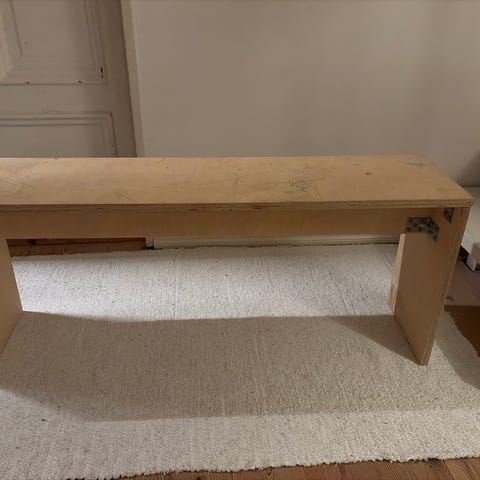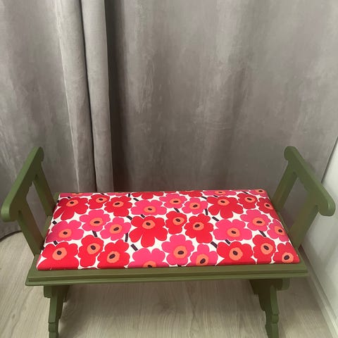 Ruskea penkki, rautaiset koriste sydämet istuinosassa, säilytetty sisätiloissa. Täyspuuta eli painaa jonkin verran. Avattava istuinosa jonka alla säilytystilaa.