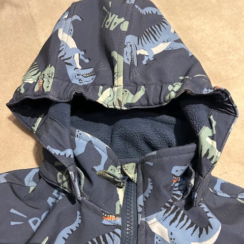Kulumaa etenkin saumapaikoissa. Puuöljystä tulleita mustia tahroja, kauluksessa purujälki. Ei kuitenkaan mitään toimenpiteitä vaativia vikoja, palvellut hyvin pihaleikeissä huonompana takkina. Vetoketju toimii moitteitta.