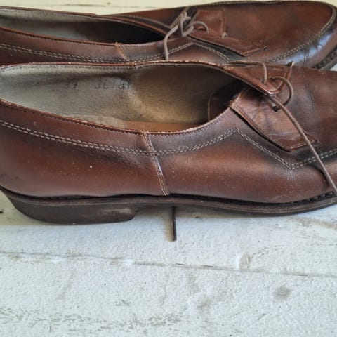Hienot kävelykegät tai golfkengät kokoa 6A eli noin 39. Vaativat uudet pohjat ja muutenkin vähän rakkautta, mutta korjaamalla käyttökelpoisiksi. Klassisen mallin vuoksi hankala sanoa, muten vanhat ovat, mutta materiaaleista ja työnjäljestä päätellen ovat 20-50-luvulta.
