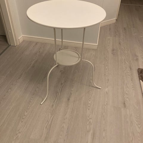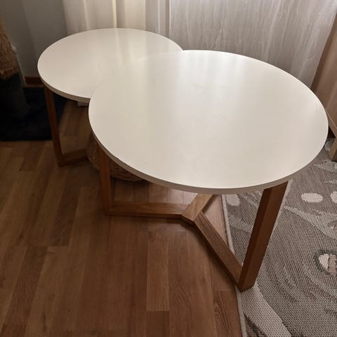 Iskusta ostettu valkoinen pyöreä sohvapöytä: halkaisija 60 cm ja korkeus 50,5 см Pinnalla on naarmut.
