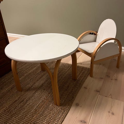 Myydään retro lasten pöytä ja tuoli. Pöydän korkeus 47cm, muut mitat n.48x48 cm. Mukaan tulee Disney-prinsessakuvioinen pöytäliina sekä tuolin pehmuste samasta kankaasta.